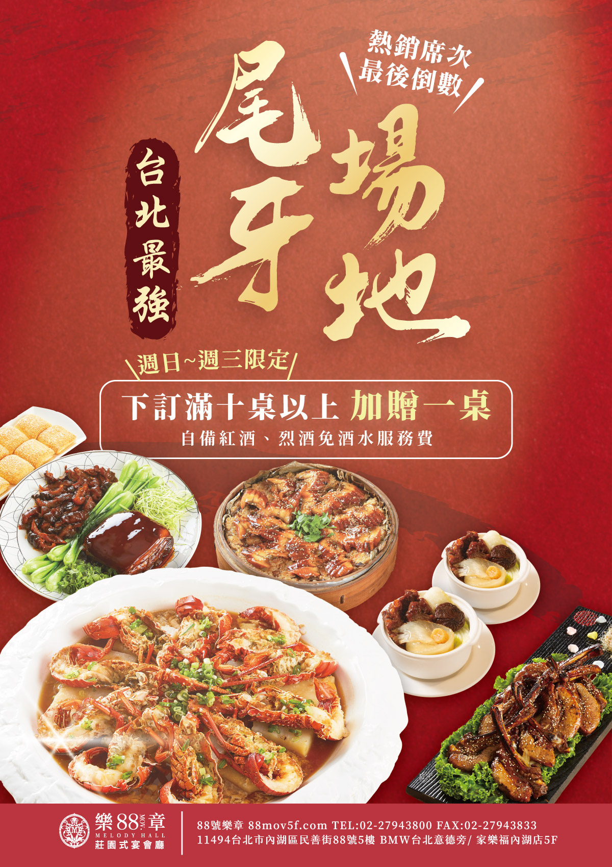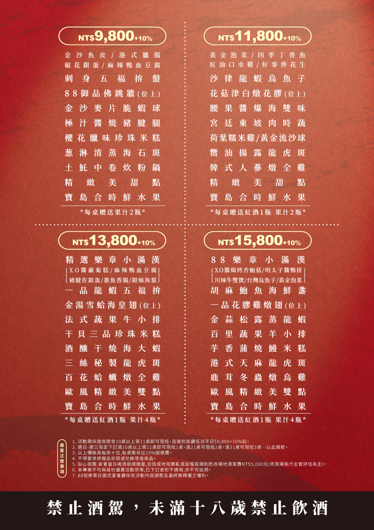 專案注意事項 1. 活動需保證席開含10桌以上第11桌即可現抵,且達到各廳低消平日$9,800+10%起。 2. 週日-週三限定下訂滿10桌以上第11桌即可現抵1桌,滿21桌可現抵2桌,滿31桌可現抵3桌‥以此類推。 3. 以上價格為每席十位,每桌需另加10%服務費。 4. 不得要求將贈品折現或兌换等值商品。 5. 貼心提醒:宴會當日喝酒敬請適量,如造成地毯髒亂或設備毀損則酌 收場地清潔費NTS5,000元(依現場執行主管評估為主) 6. 本專案不可與其他優惠活動併用,已下訂者恕不適用,亦不可追溯。 7. 88號樂章莊園式宴會廳保有活動内容調整及最終解釋權之權利。