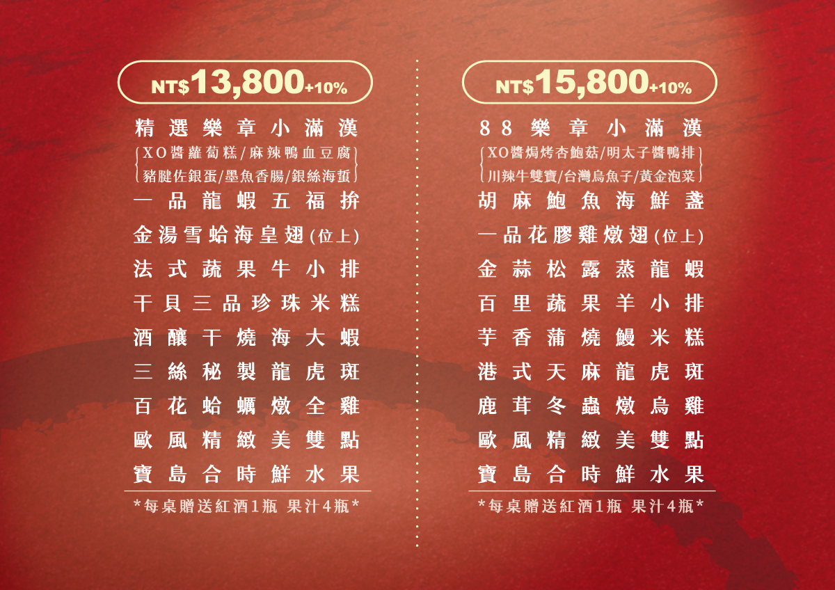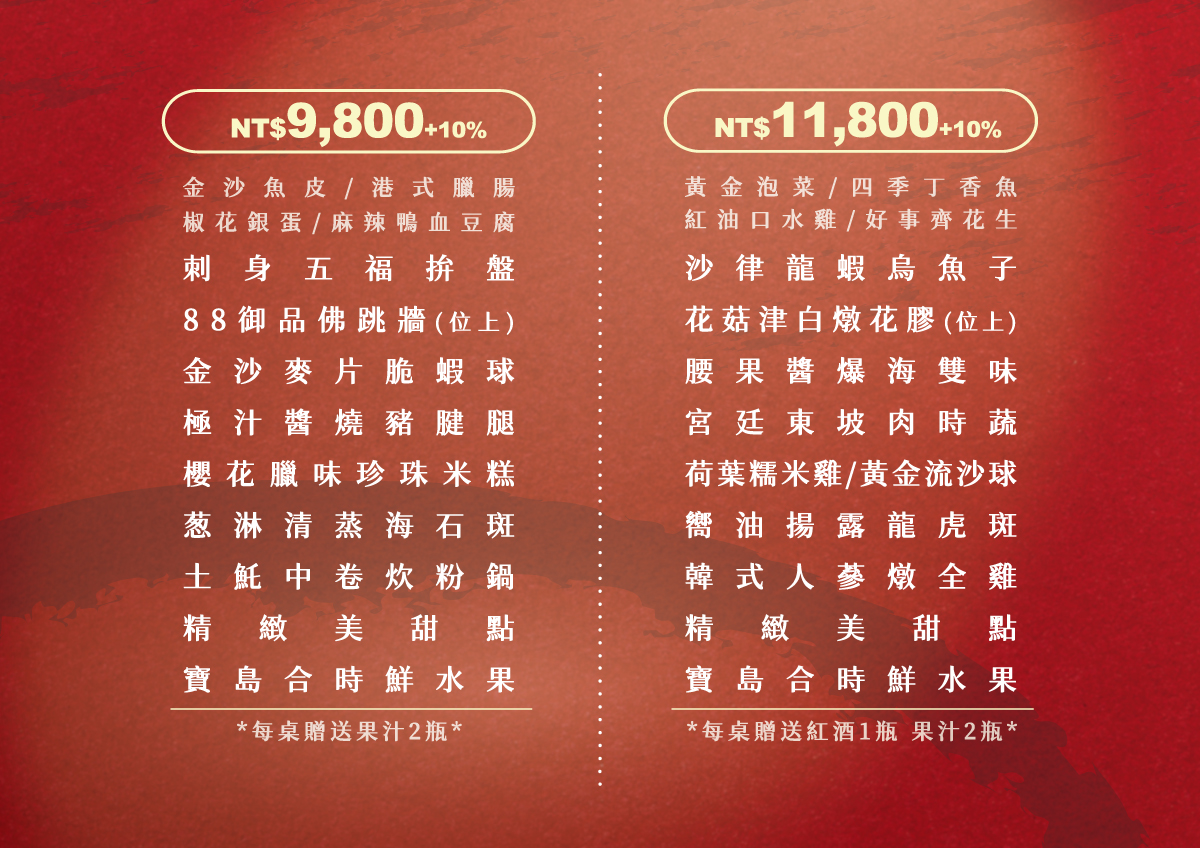 4. 以上價格為每席十位,每桌需另加10%服務費。
