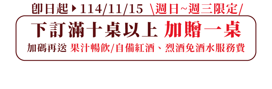 3. 週日-週三限定下訂滿10桌以上第11桌即可現抵1桌,滿21桌可現抵2桌,滿31桌可現抵3桌‥以此類推。