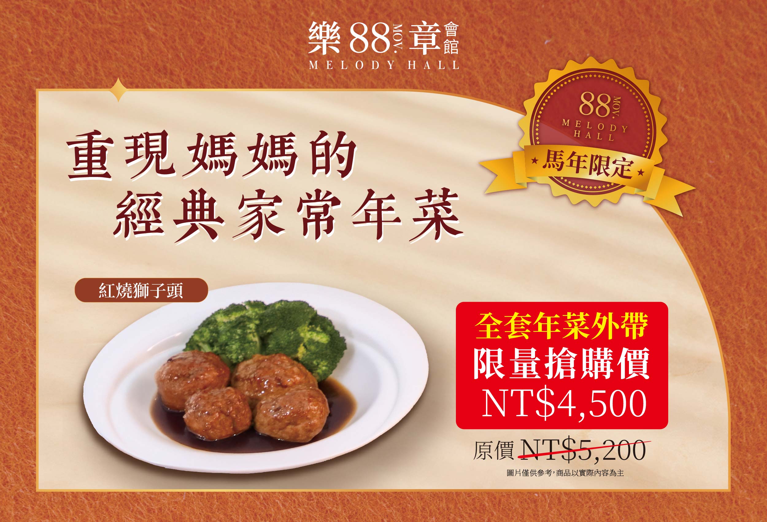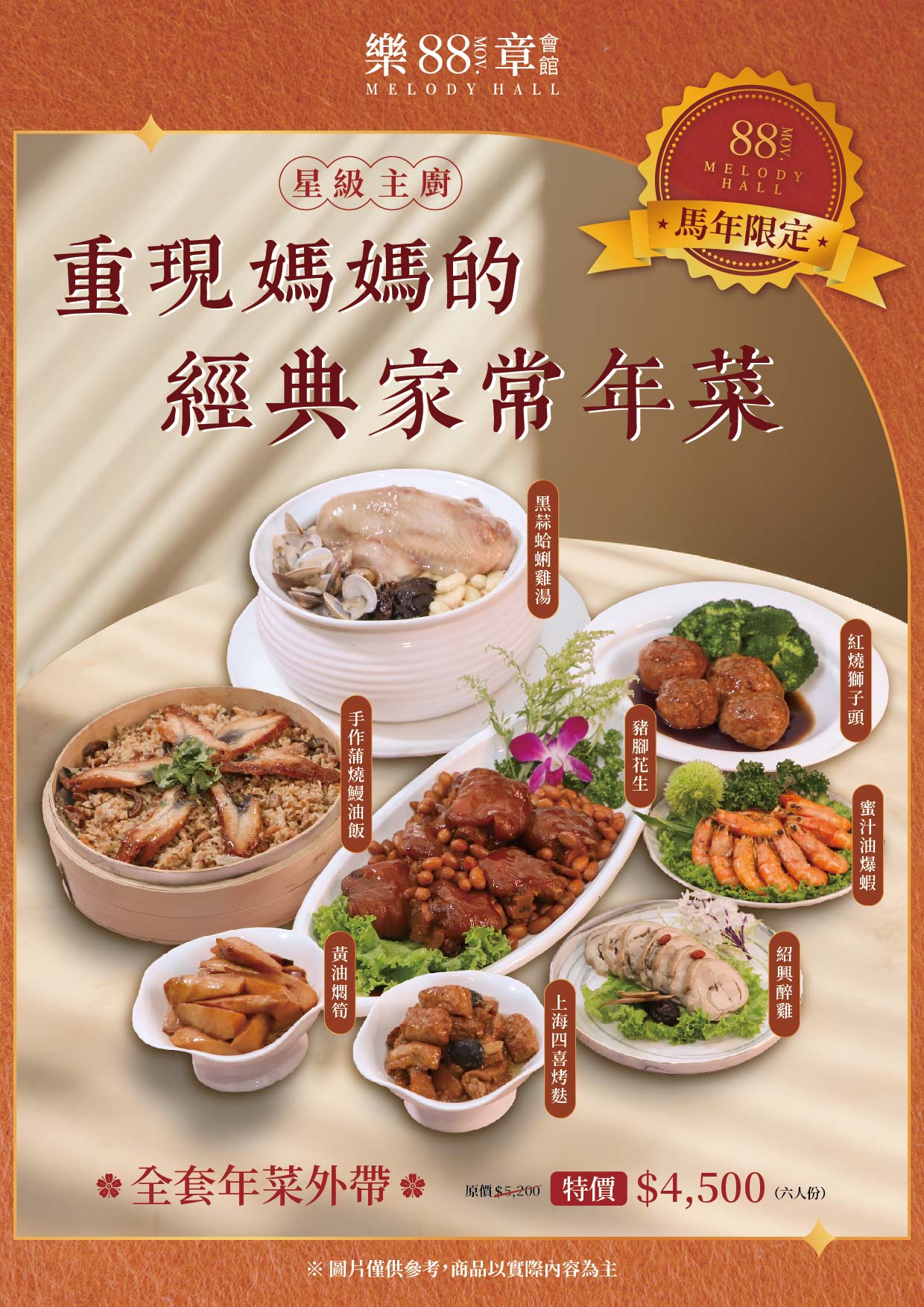 年菜內容(六人份):上海四喜烤麩/黃油燜筍/紹興醉雞/蜜汁油爆蝦/豬腳花生/蒲燒鰻油飯/紅燒獅子頭/黑蒜蛤蜊雞湯