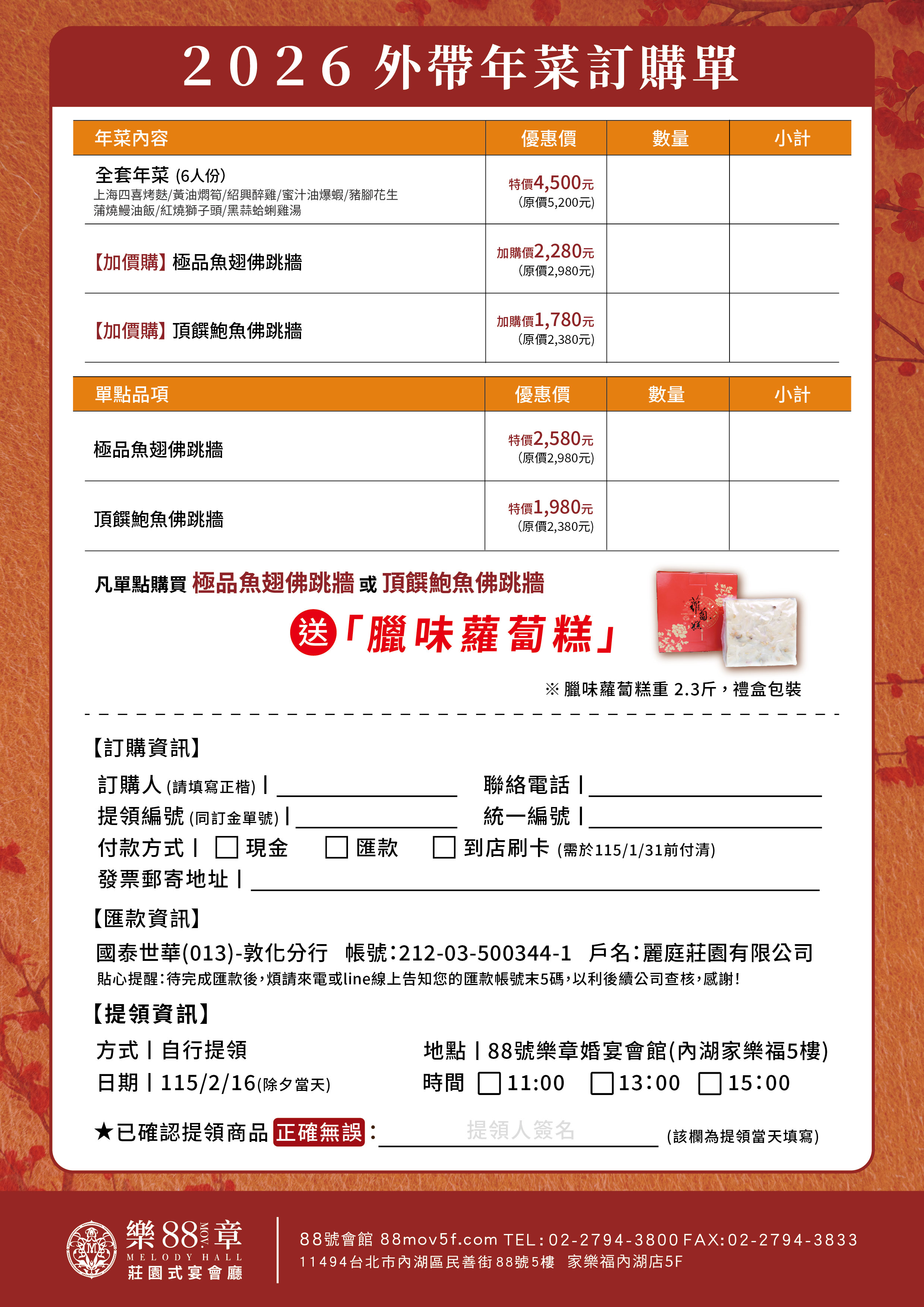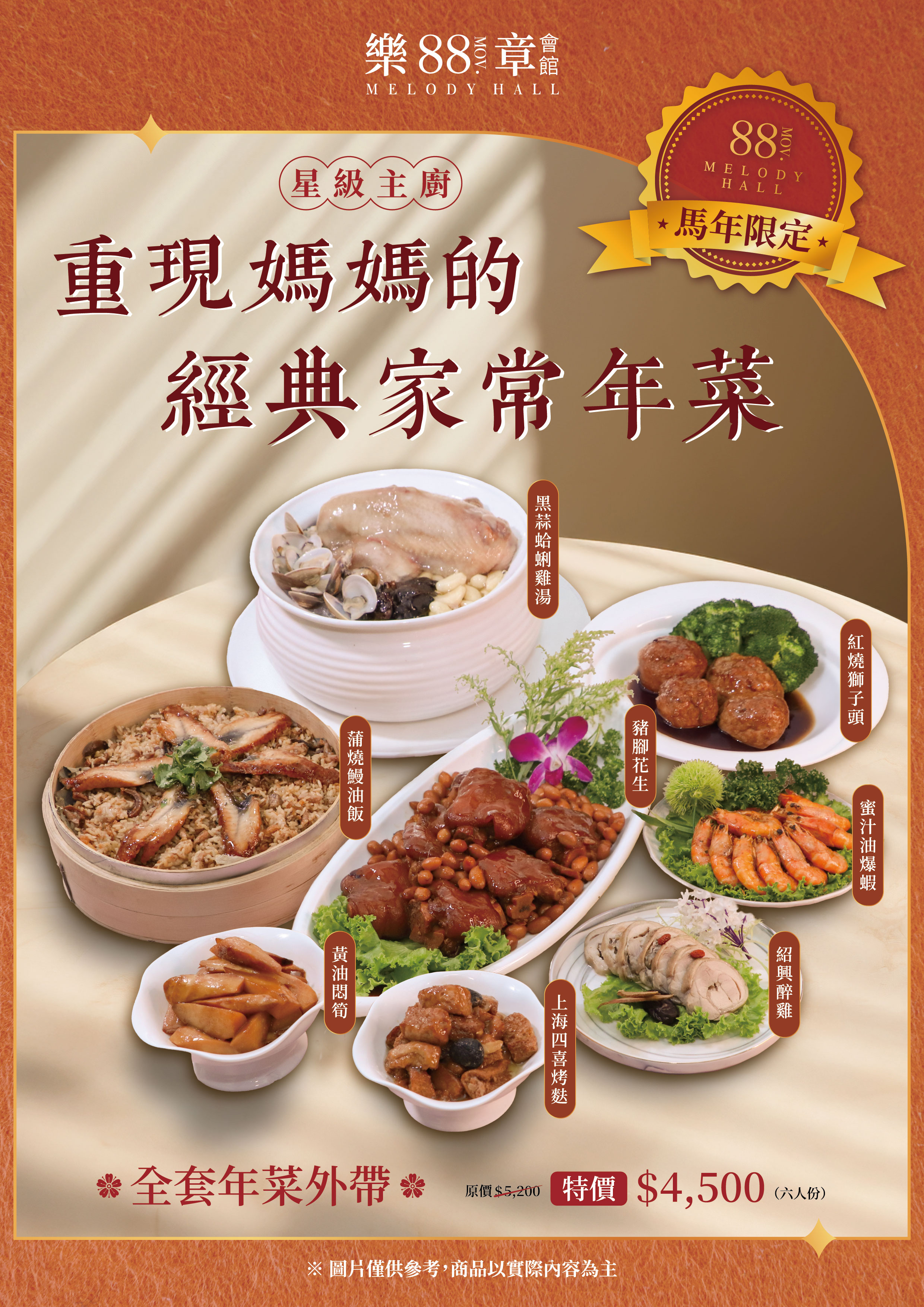 年菜內容(六人份):上海四喜烤麩/黃油燜筍/紹興醉雞/蜜汁油爆蝦/豬腳花生/蒲燒鰻油飯/紅燒獅子頭/黑蒜蛤蜊雞湯